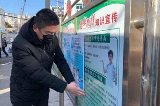 ▲  郭伟在张贴防疫海报